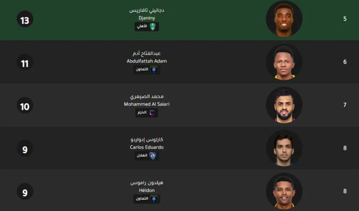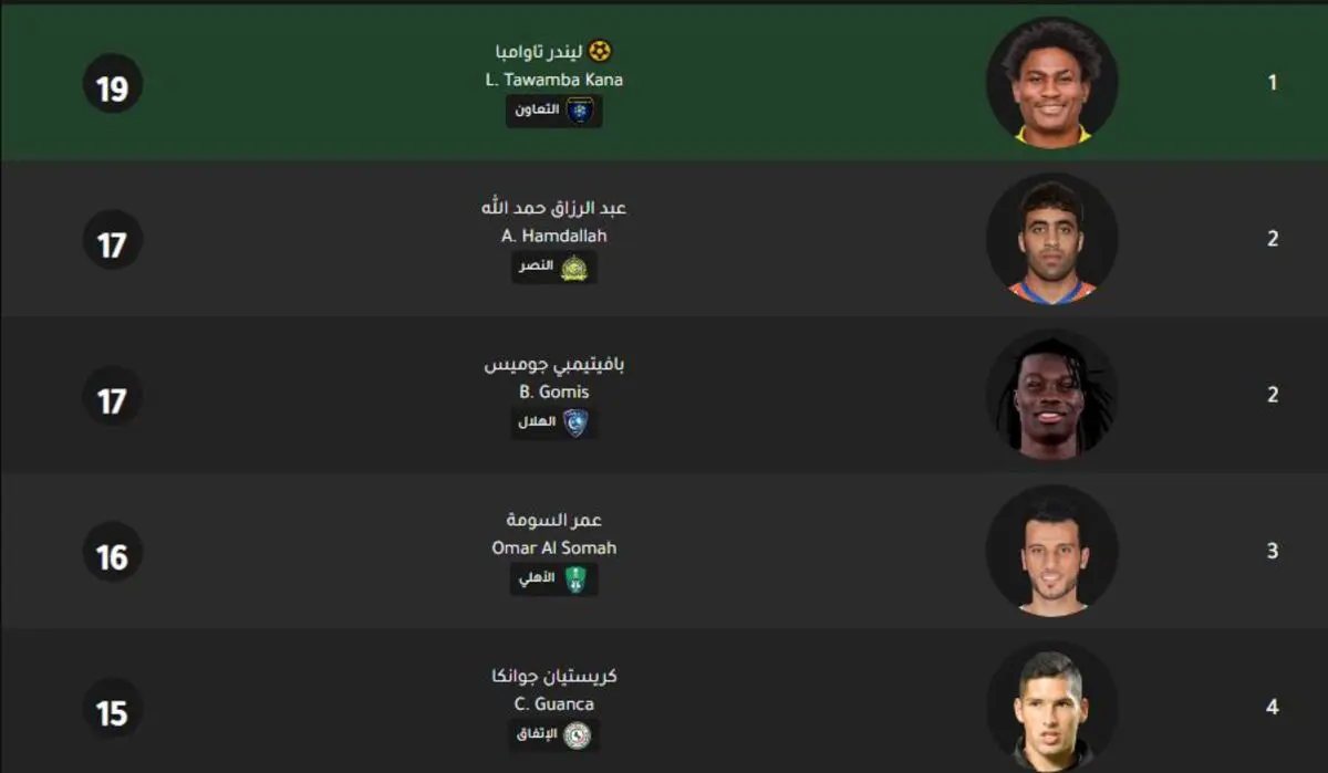 ويتصدر الكاميروني ليندر تاوامبا هدافي الدوري برصيد 19 هدفًا، ويليه الفرنسي بافيتيمبي غوميز مهاجم الهلال، في المرتبة الثانية برصيد 17 هدفًا، بالتساوي مع عبدالرازق حمد الله لاعب النصر.