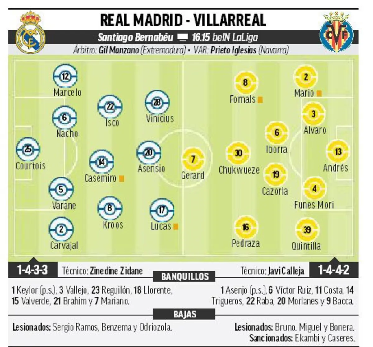 توقعت بضع صحف إسبانية التشكيلة المتوقعة لمباراة ريال مدريد ضد فياريال، في المواجهة التي تجمع الفريقين، مساء اليوم الأحد، على ملعب ”سانتياغو برنابيو“، ضمن منافسات الجولة الـ 36 من الدوري الإسباني.