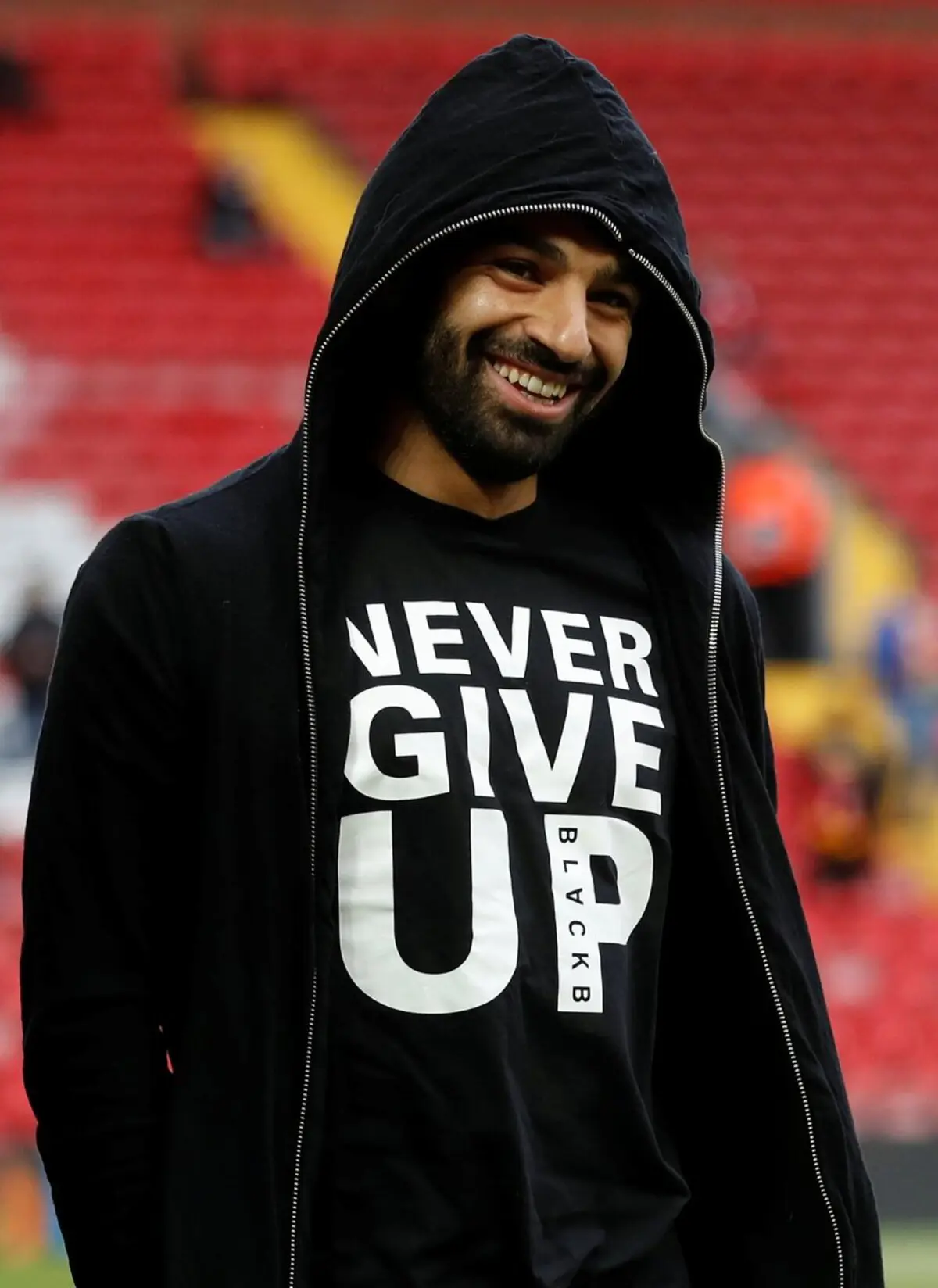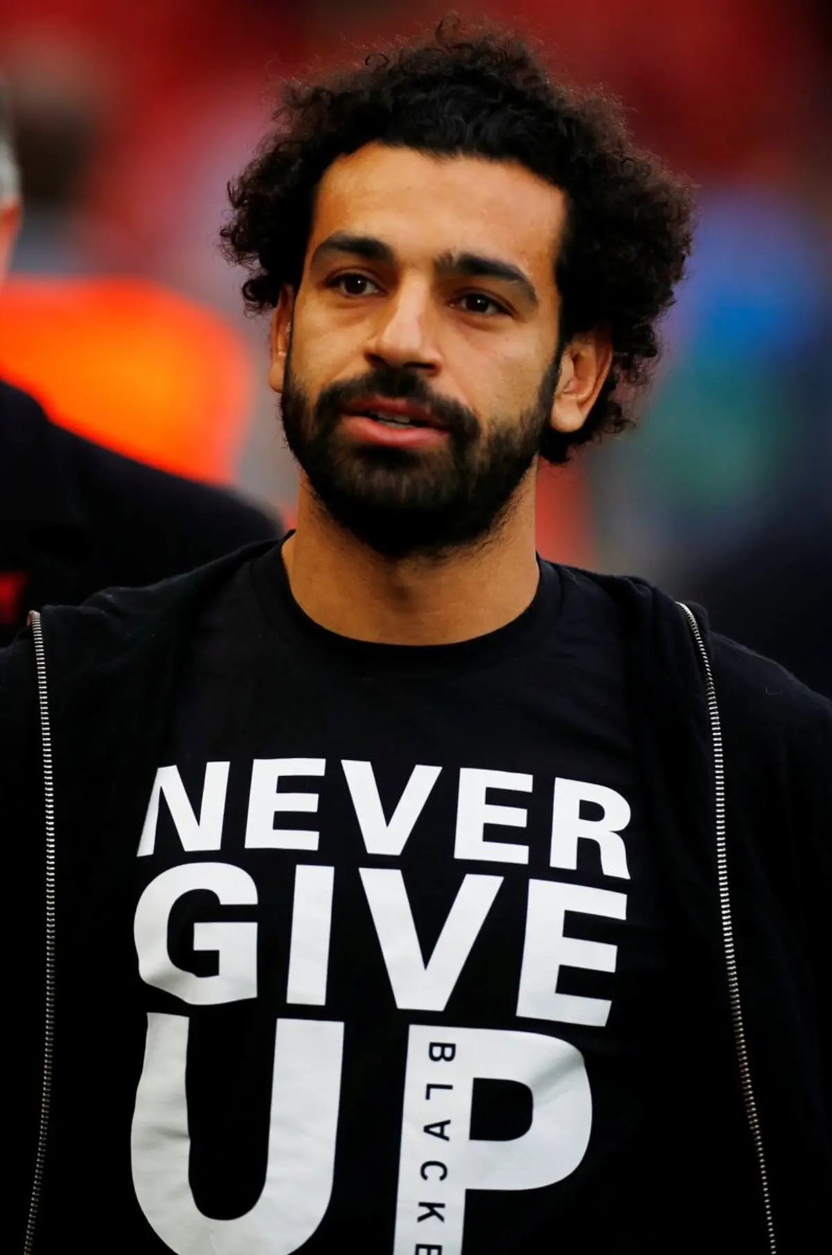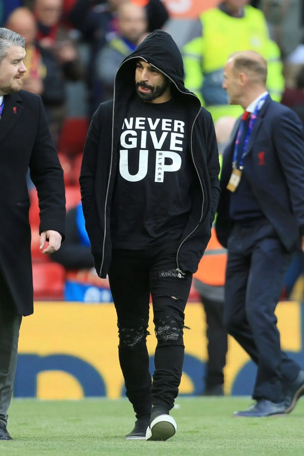 ووصل صلاح إلى ملعب الأنفيلد بتيشيرت مكتوب عليه " Never Give Up " لا تستسلم أبدًا قبل المواجهة المرتقبة.