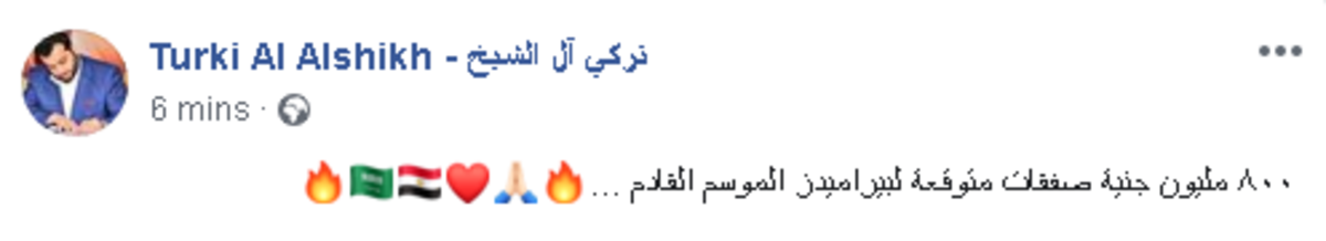 وكتب آل الشيخ منشورًا عبر حسابه الشخصي على "فيسبوك"، قال فيه: "800 مليون جنية صفقات متوقعة لبيراميدز الموسم المقبل".