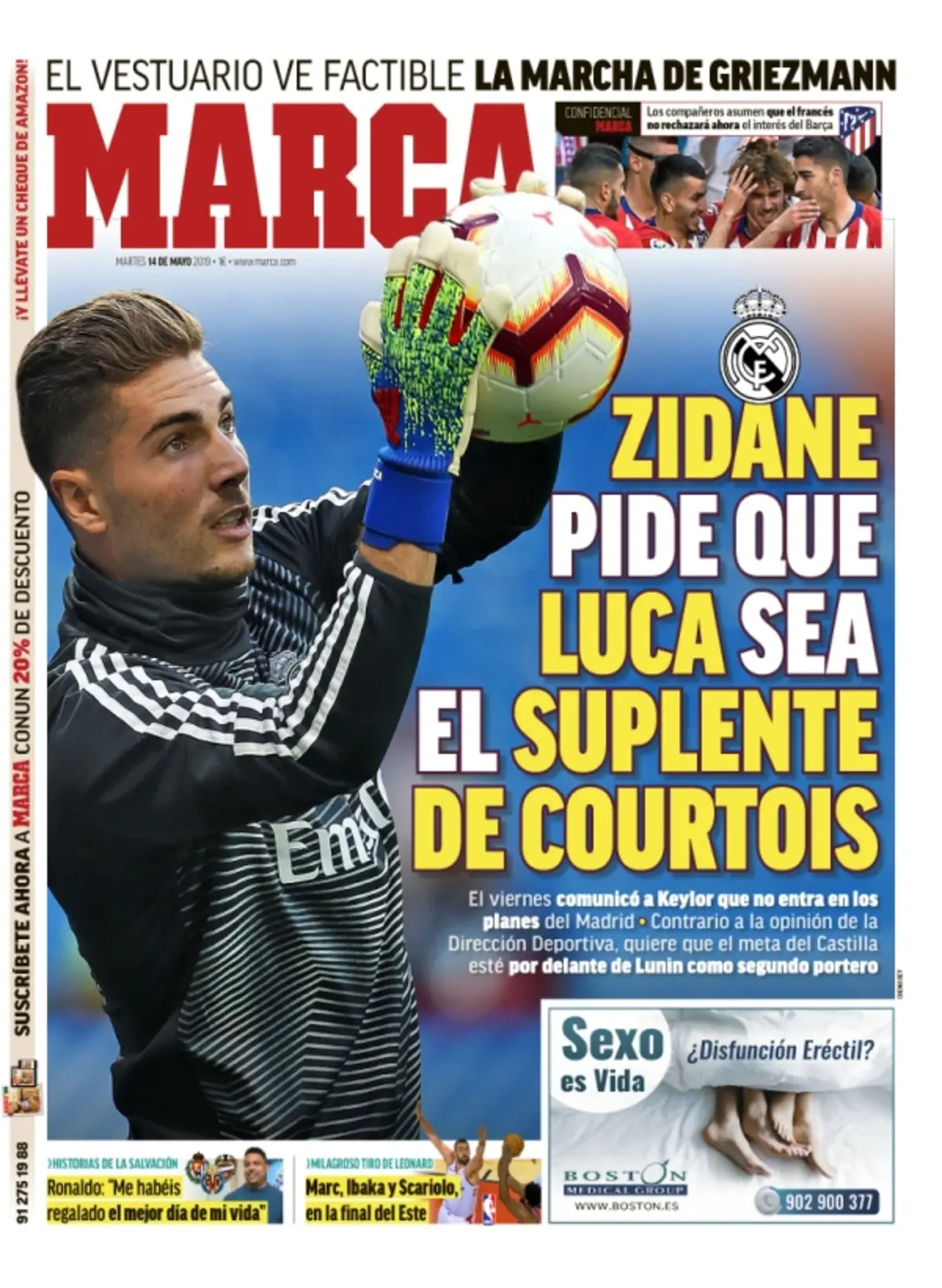 تحدثت الصحيفة عن قرار الفرنسي زين الدين زيدان مدرب ريال مدريد فيما يخص حراسة المرمى بعد إخبار كايلور نافاس بقرار الخروج :" زيدان يرغب في أن يكون لوكا زيدان بديل تيبو كورتوا في حراسة المرمى ".