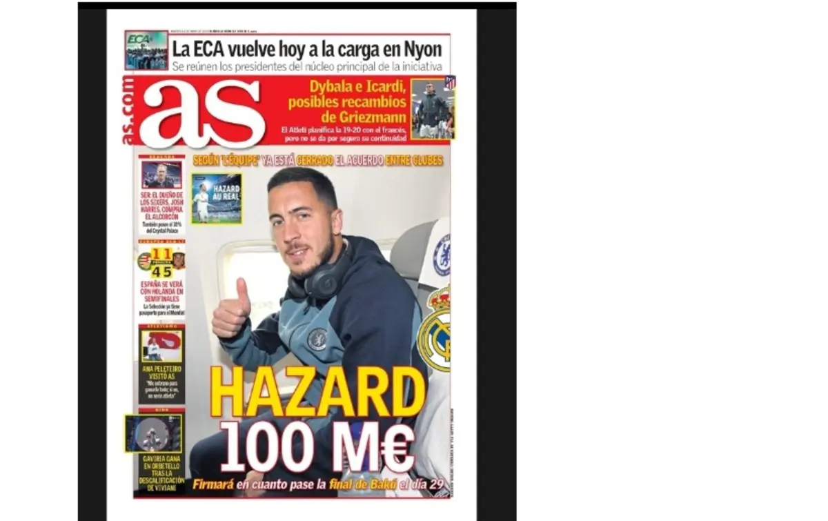 ركزت الصحيفة المدريدية على صفقة انتقال النجم البلجيكي إيدين هازارد لريال مدريد وكتبت " هازارد : 100 مليون يورو ".