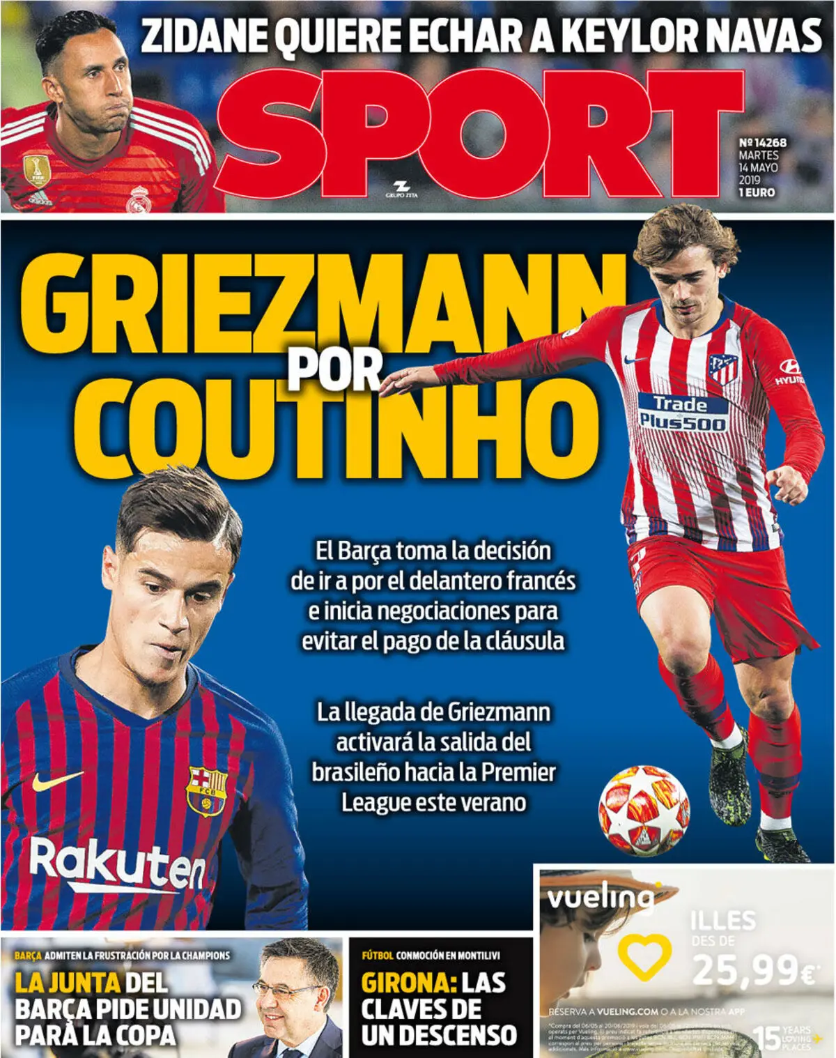 اهتمت سبورت بصفقة أنطوان غريزمان وعلاقتها برحيل البرازيلي فيليب كوتينيو وكتبت :" غريزمان مقابل كورتينيو " في إشارة إلى كون التعاقد مع الفرنسي يدفع البرازيلي للرحيل.