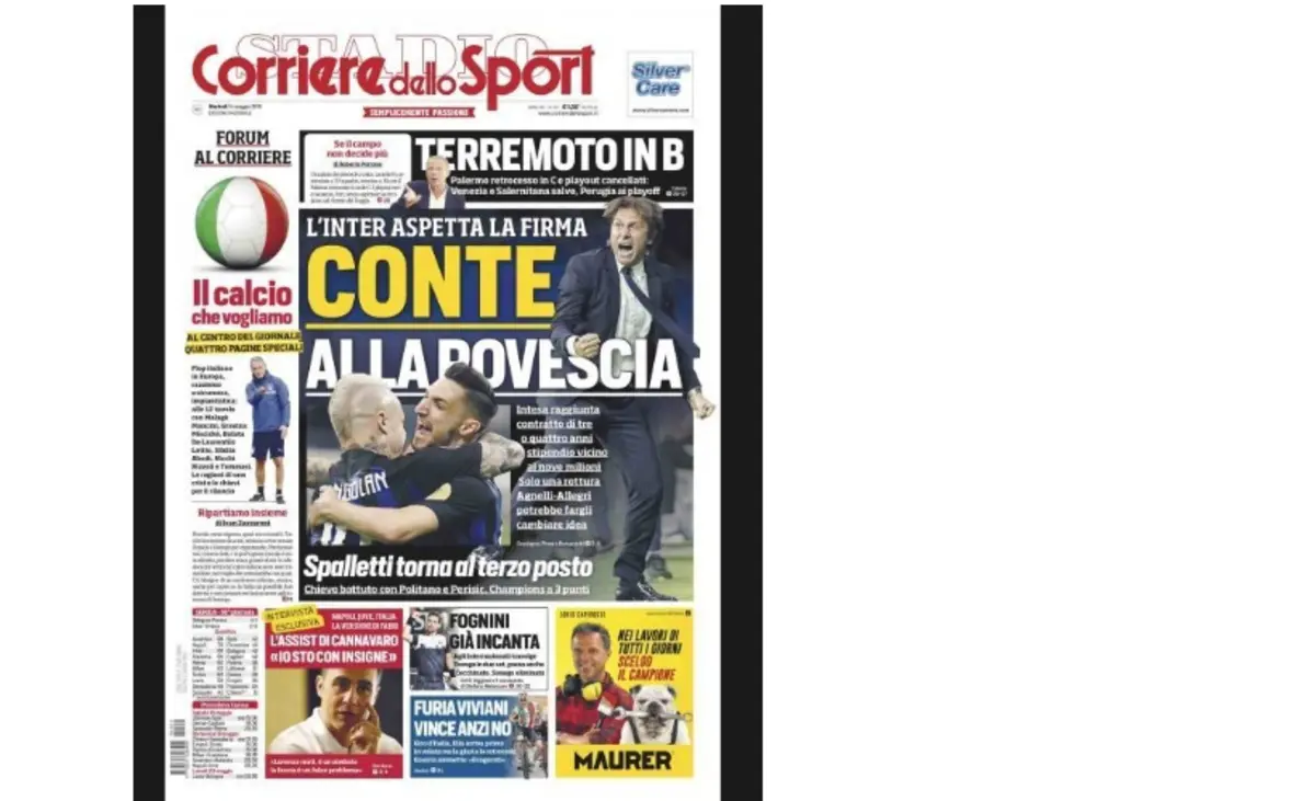 ركزت الصحيفة على خبر تدريب كونتي لإنتر ميلان والتغييرات المنتظرة في الفريق كما تحدثت عن فوز الفريق واقترابه من دوري أبطال أوروبا.