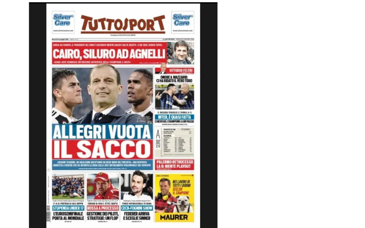 تحدثت الصحيفة عن يوفنتوس ومدربه ماسيميليانو أليغري الذي يهدد عدة لاعبين بالرحيل ونشرت برفقته صورة للثنائي باولو ديبالا ودوغلاس كوستا وكتبت :" أليغري يفرغ الكيس ".