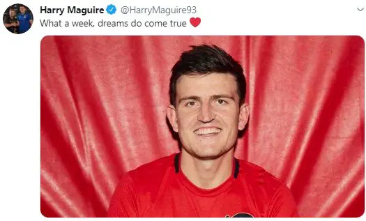 نشر هاري ماغواير لاعب نادي مانشستر يونايتد الإنجليزي صورة له عبر صفحته الشخصية وعلق قائلًا: "يا له من أسبوع، تتحقق الأحلام حيث انضم اللاعب إلى قلعة الأولد ترافولد منذ أيام قليلة قبل انطلاق منافسات الدوري الإنجليزي".