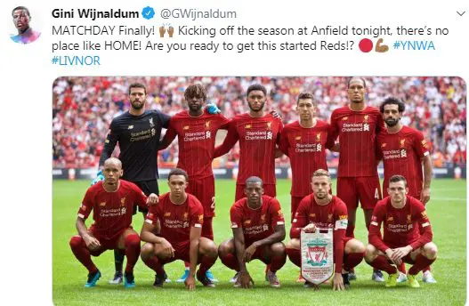نشر جورجينيو فينالدوم لاعب نادي ليفربول الإنجليزي صورة جماعية للريدز وعلق قائلًا: "مباراة أخيرًا .. انطلاق الموسم في الإنفيلد الليلة، لا يوجد مكان مثل بيتي هل أنت مستعد لبدء هذا".
