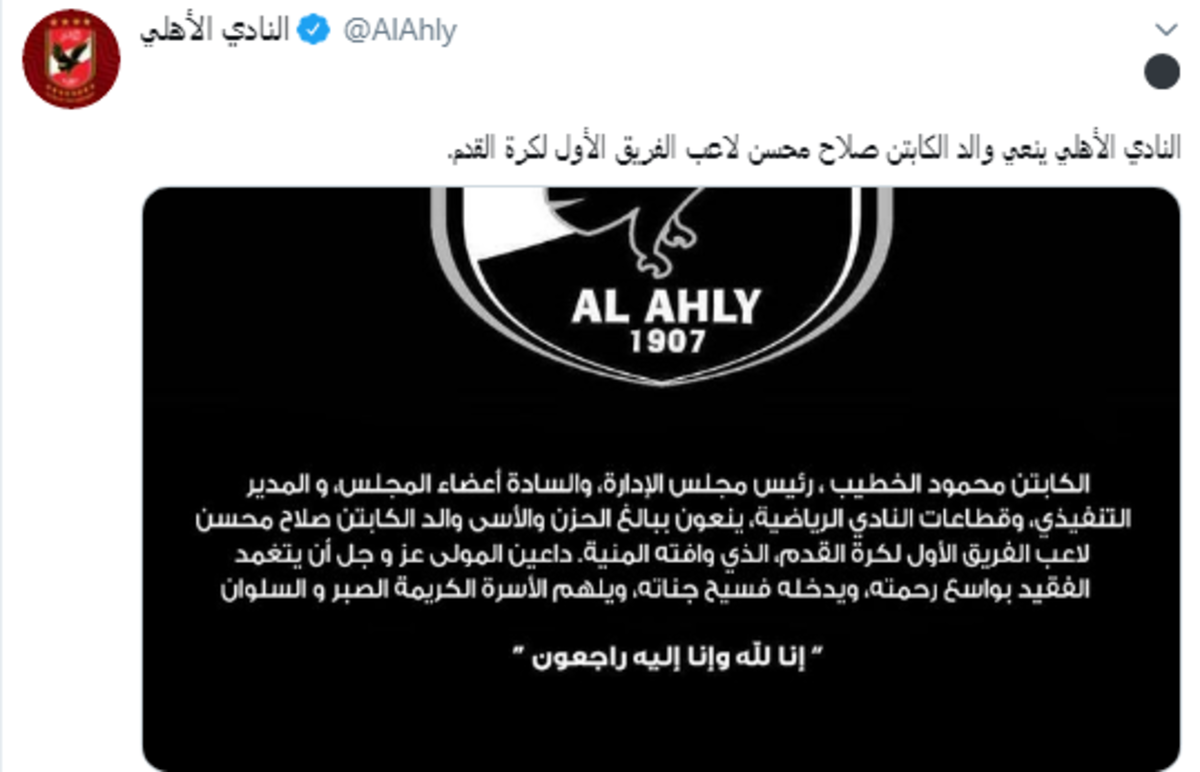 حرصت الصفحة الرسمية للنادي الأهلي على الشد من أزر مهاجم الفريق صلاح محسن، حيث نشرت نعيًا لوالد اللاعب الذي وافته المنية اليوم قائلة: "النادي الأهلي ينعي والد الكابتن صلاح محسن لاعب الفريق الأول لكرة القدم".