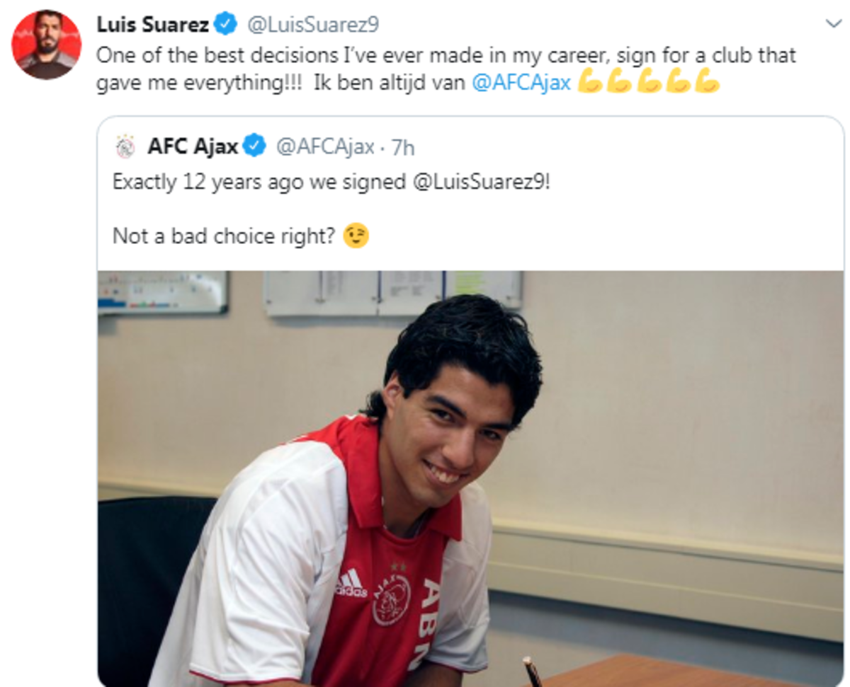 أعاد لويس سواريز مهاجم نادي برشلونة الإسباني ما نشرته الصفحة الرسمية لنادي أياكس أمستردام الإنجليزي والتي نشرت صورة لسواريز بقميص النادي للمرة الأولى منذ 12 عامًا، وعلق قائلًا: "واحدة من أفضل القرارات التي اتخذتها في حياتي المهنية، قمت بالتوقيع مع نادٍ قدم لي كل شيء".