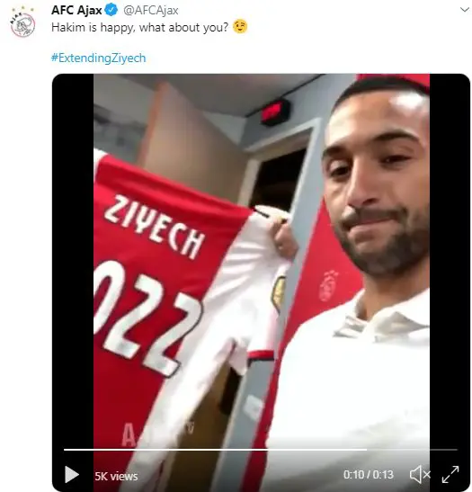 نشرت الصفحة الرسمية لنادي أياكس أمستردام الهولندي فيديو للاعب الفريق حكيم زياش وهو تبدو عليه السعادة عقب تجديد تعاقده مع ناديه وعلقت قائلة: أياكس حكيم سعيد، ماذا عنك؟".