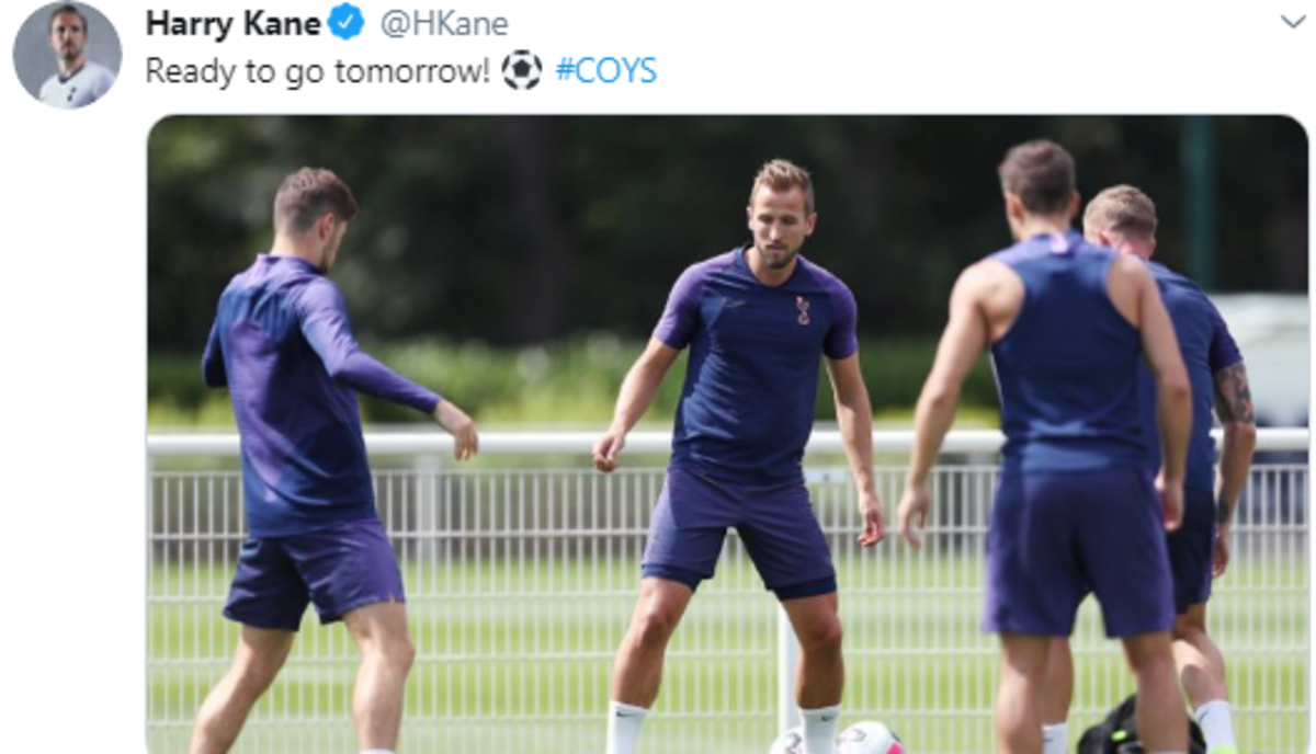 نشر هاري كين مهاجم نادي توتنهام الإنجليزي صورة له عبر صفحته الشخصية وعلق قائلًا: "على استعداد للذهاب غدًا"، حيث يستعد كين لانطلاق الموسم الجديد للدوري الإنجليزي.