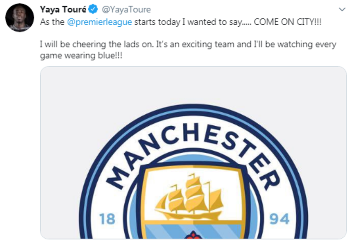 حرص الإيفواري يايا توريه نجم نادي مانشستر سيتي الإنجليزي السابق على دعم فريقه السابق قبل بدء منافسات الدوري الإنجليزي، حيث نشر صورة لشعار النادي عبر صفحته الشخصية وعلق قائلًا: "الدوري الممتاز يبدأ اليوم أردت أن أقول..... تعال إلى المدينة !!! سأهتف للفتيان.. إنه فريق مثير وسأشاهد كل لعبة ترتدي اللون الأزرق".