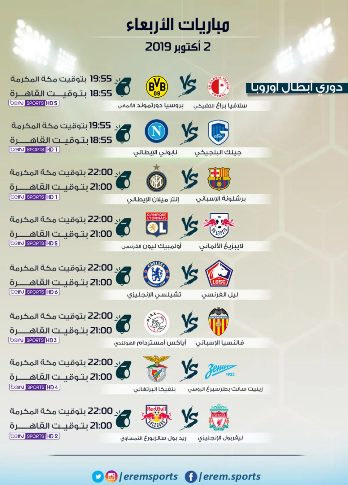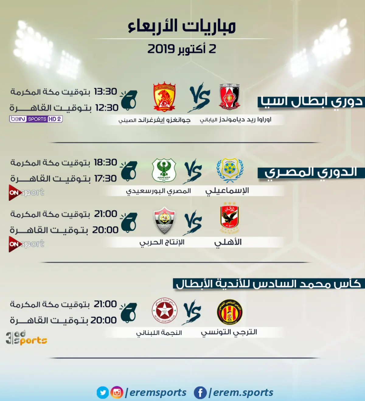 وفيما يأتي مواعيد مباريات اليوم الأربعاء الثاني من أكتوبر/تشرين الأول، والقنوات الناقلة لها، مع ملاحظة أن جميع المواعيد المذكورة هي بتوقيت مكة المكرمة والقاهرة: