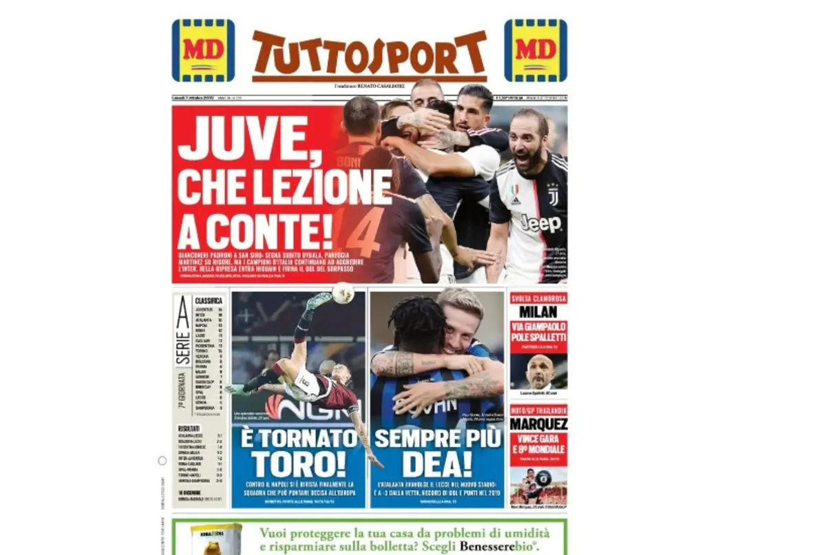 ركزت الصحيفة على فوز يوفنتوس في لقاء القمة على إنتر ميلانو 2-1 وتصدره لترتيب الدوري الإيطالي، وكتبت: "يوفنتوس يا له من درس لكونتي".