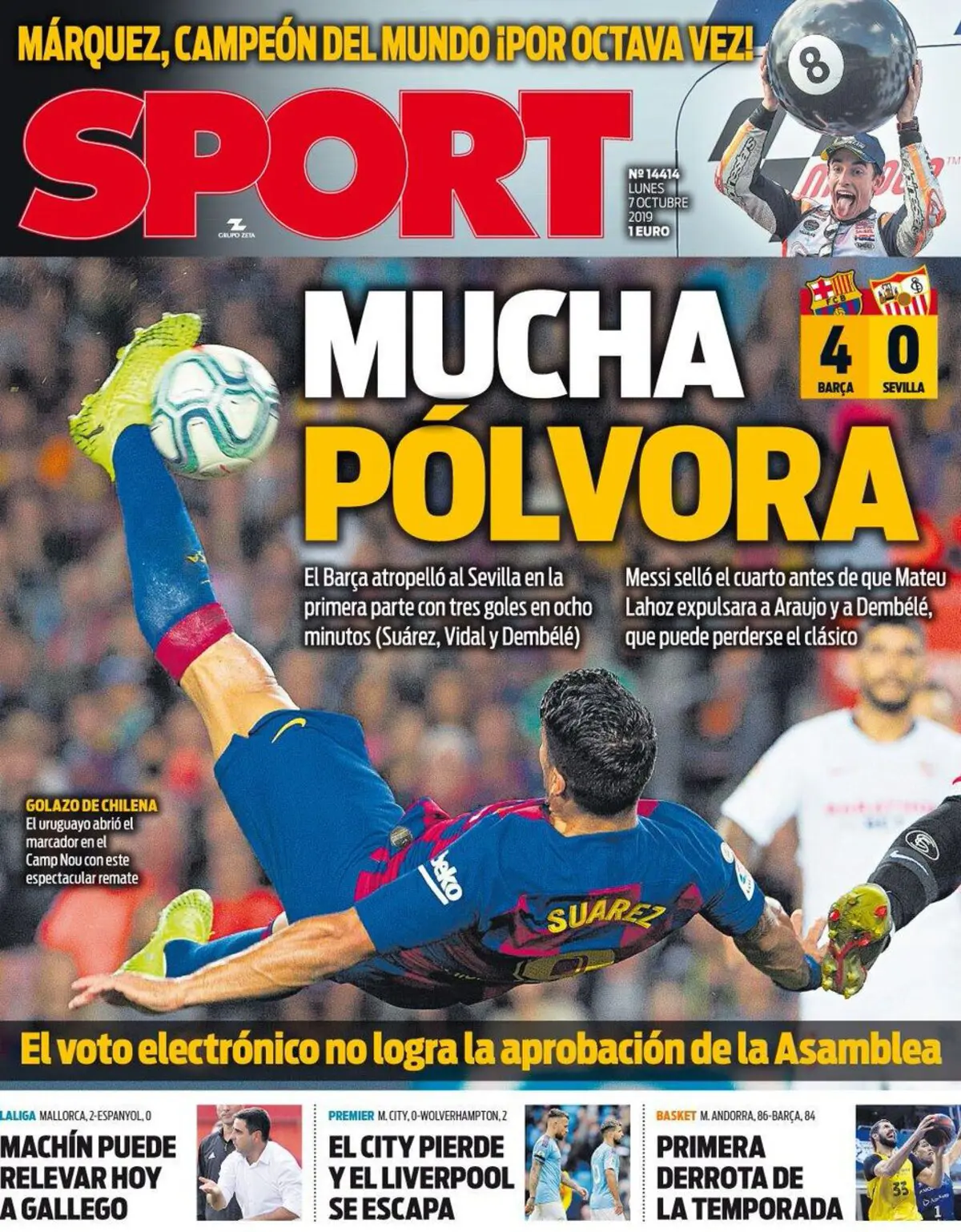 اهتمت الصحيفة بفوز برشلونة الكبير على إشبيلية 4-0 وارتقائه لوصافة ترتيب الدوري الإسباني الدرجة الأولى خلف غريمه التقليدي ريال مدريد بفارق نقطتين، وكتبت: "الكثير من البارود".