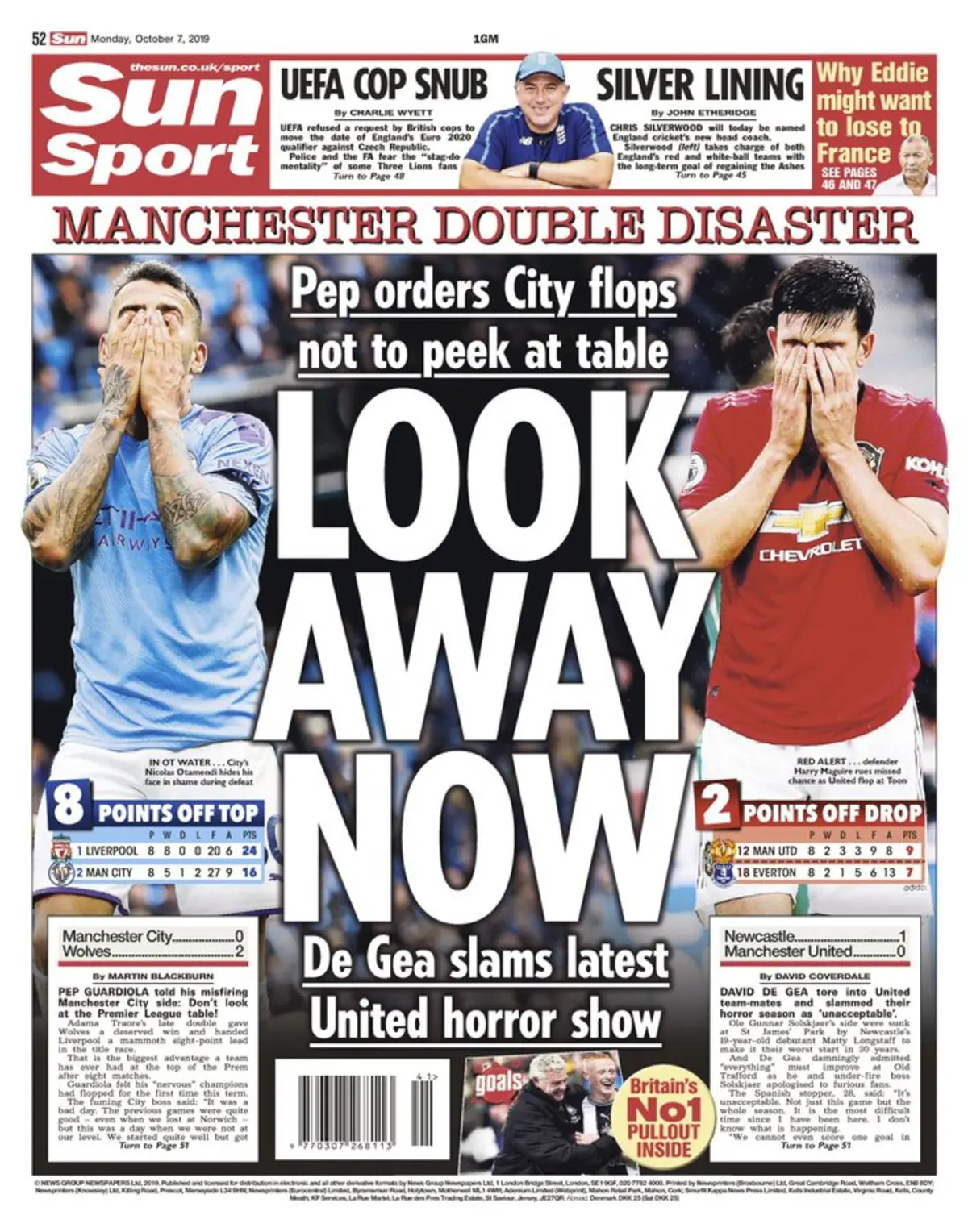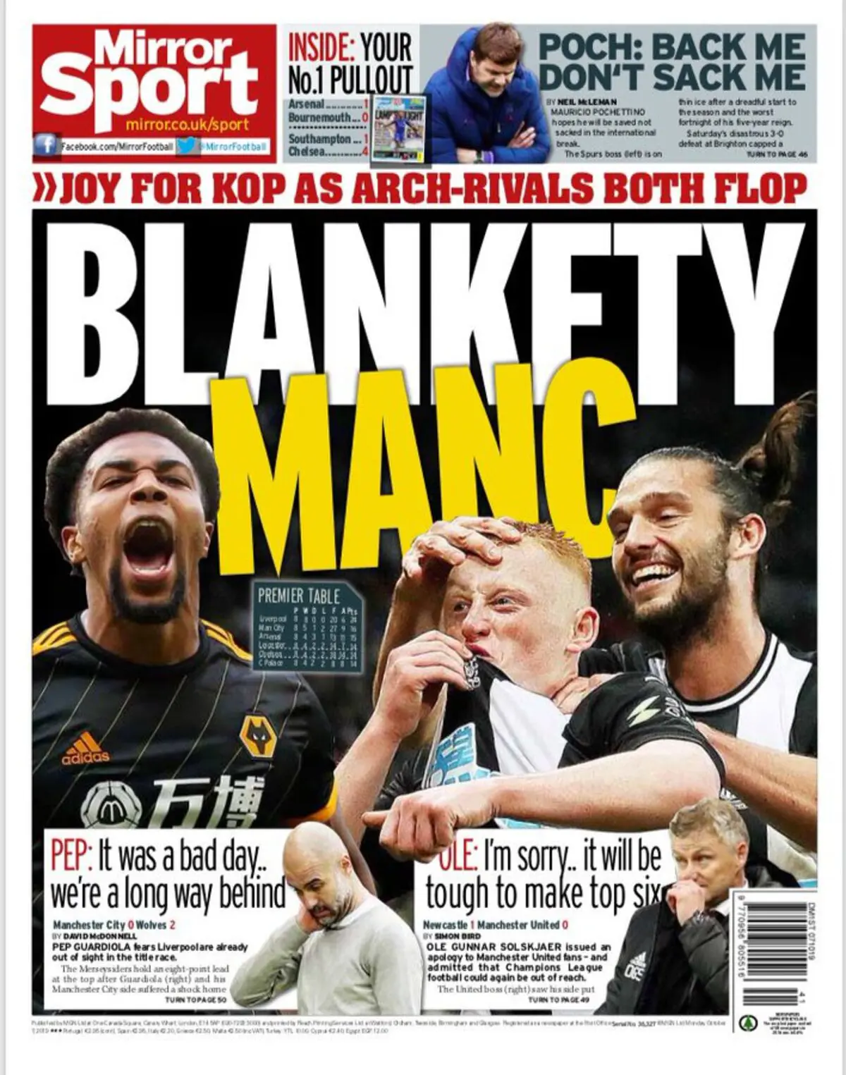 ركزت الصحيفة على هزيمة قطبي مانشستر، حيث خسر مانشستر سيتي في ملعبه أمام وولفرهامبتون وخسر مانشستر يوناتيد أمام نيوكاسل، وكتبت: "فرق مانشستر تعاني من نتائج كارثية.. وليفربول يربح المزيد من النقاط ويونايتد يواصل مسلسل الرعب".