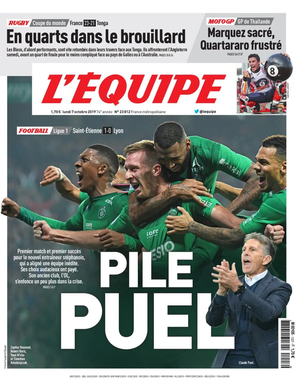 ركزت الصحيفة على ديربي سانت إيتيان وأولمبيك ليون، والذي انتهى لصالح سانتيان 1-0 بهدف قاتل في الدقيقة الأخيرة، وكتبت: "بطارية بويل"، في إشارة للمدرب الجديد للفريق كلود بويل الذي تولى المنصب قبل 48 ساعة من اللقاء.