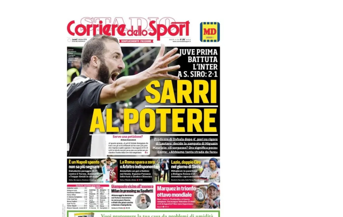 ركزت الصحيفة على فوز يوفنتوس على إنتر ميلان في لقاء قمة الدوري الإيطالي، وهي الخسارة الأولى للإنتر، وكتبت: "ساري في السلطة"، بعدما تصدر فريقه الدوري.