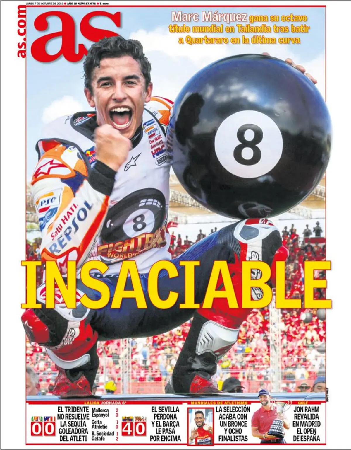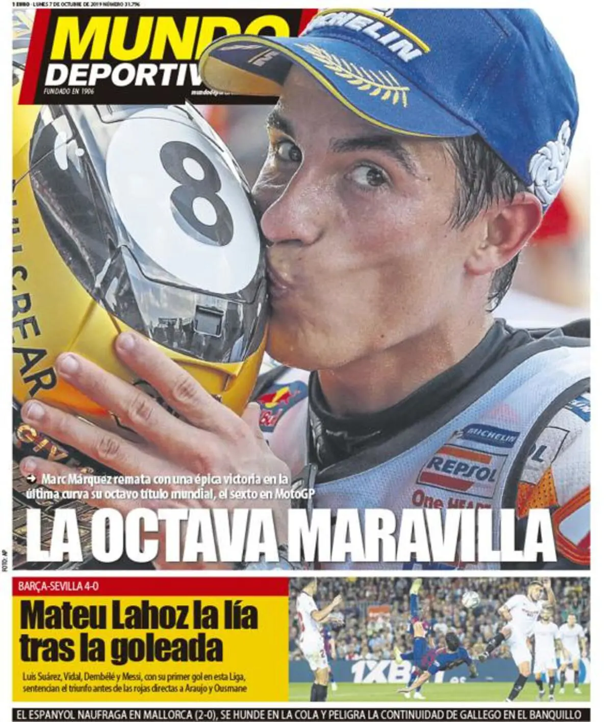 اهتمت الصحيفة بفوز الإسباني مارك ماركيز بلقبه العالمي الثامن في كل الفئات في سباقات الموتوجيبي بعد فوزه في سباق تايلاند، وكتبت: "الثامنة الرائعة".