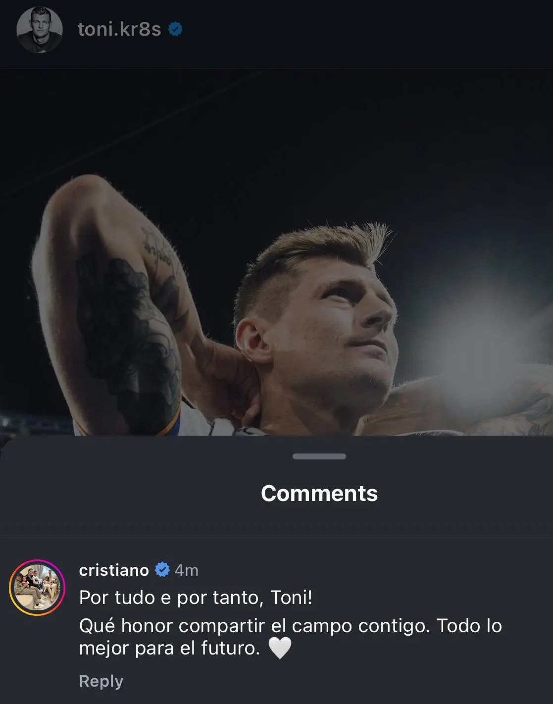 وكتب رونالدو رسالة إلى توني كروس، عبر حسابه على "إنستغرام"، قائلا: "شكرًا على كل شيء توني، يا له من شرف عظيم مشاركة اللعب معك، أتمنى التوفيق لك في المستقبل".