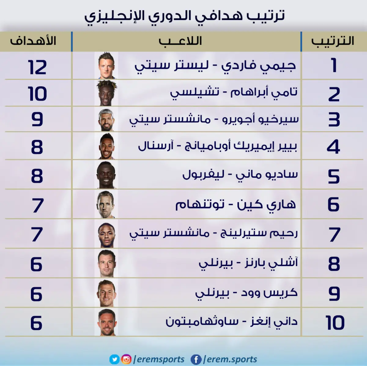 كما سجل النجم جيمي فاردي هدف لفريقه ليستر سيتي من ركلة جزاء في شباك نظيره برايتون ليعزز صدارته للقائمة.