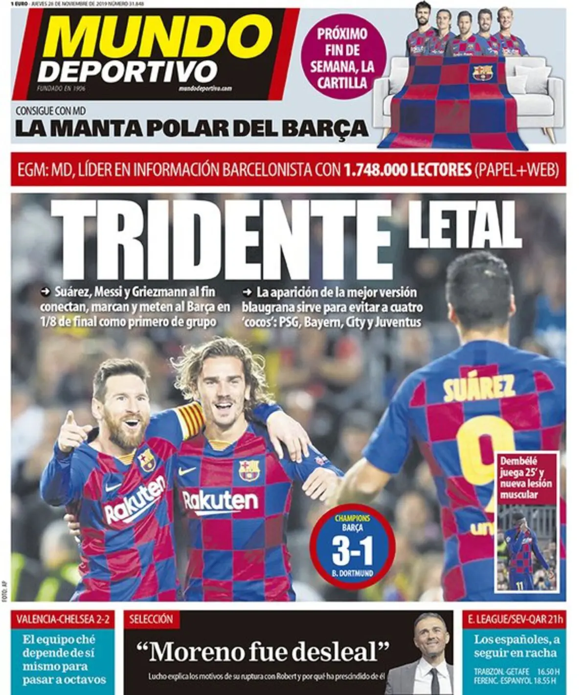 ركزت الصحيفة على فوز برشلونة أمام بروسيا دورتموند الألماني 3-1 وتأهله متصدرًا مجموعته في دوري أبطال أوروبا بفضل تألق ثلاثي هجومه وكتبت :" ثلاثي قاتل ".