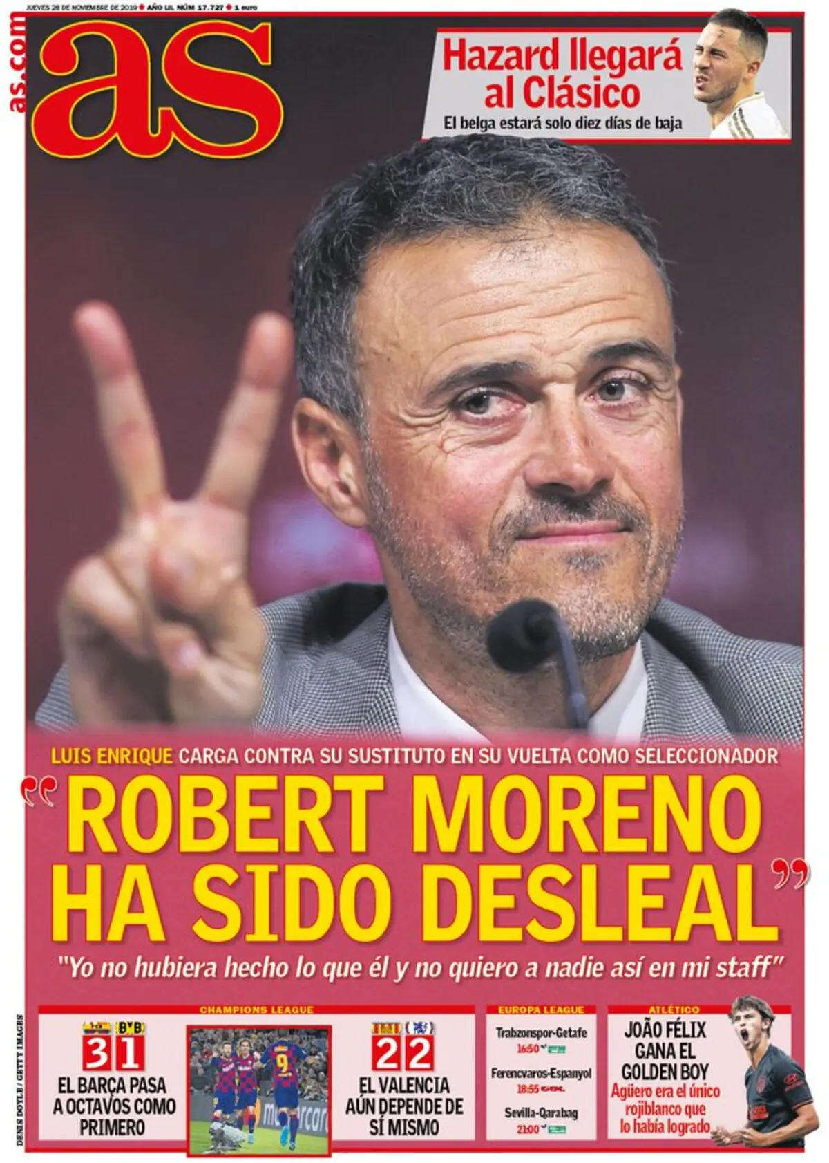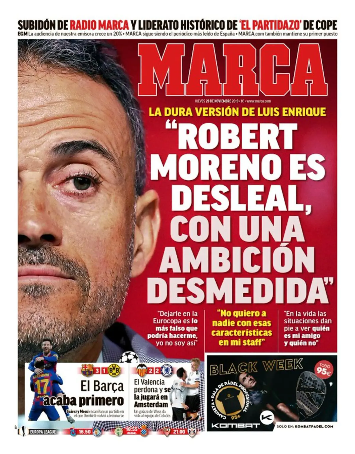 ركزت الصحيفة على تصريحات لويس إينركي مدرب منتخب إسبانيا ضد مساعده السابق والمدرب روبيرت مورينو وكتبت :" روبيرت مورينو كان غير عادل ".