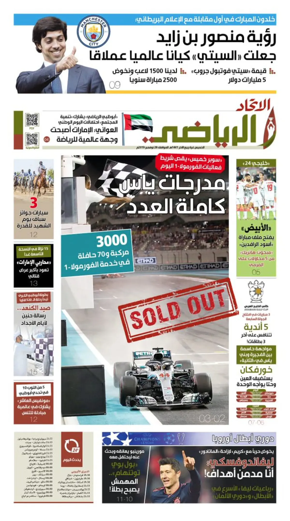 ركزت الصحيفة على فريق مانشستر سيتي وكتبت :" رؤية منصور بن زايد جعلت السيتي كيانًا عالميًّا عملاقًا ".