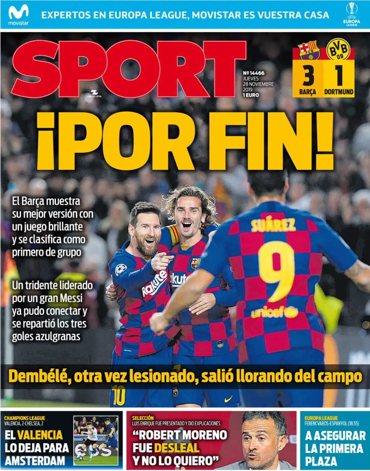 ركزت الصحيفة على فوز برشلونة في دوري أبطال أوروبا على بروسيا دورتموند الألماني بتألق من ثلاثي الهجوم وكتبت :" وأخيرًا ".
