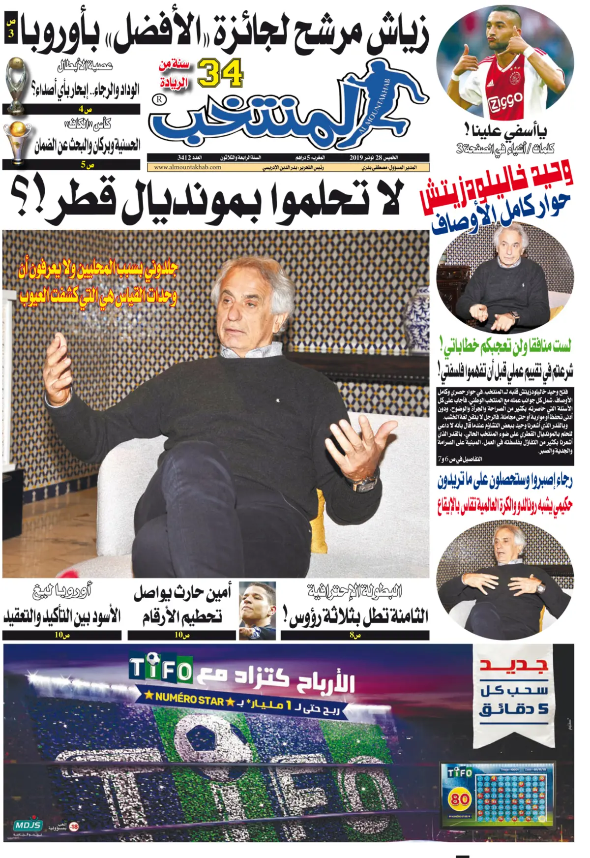 اهتمت الصحيفة بحوارها مع البوسني وحيد حاليلوزيتش مدرب المنتخب المغربي والذي تحدث عن عمله ومستقبل المنتخب وكتبت على لسانه :" لا تحلموا بمونديال قطر ".