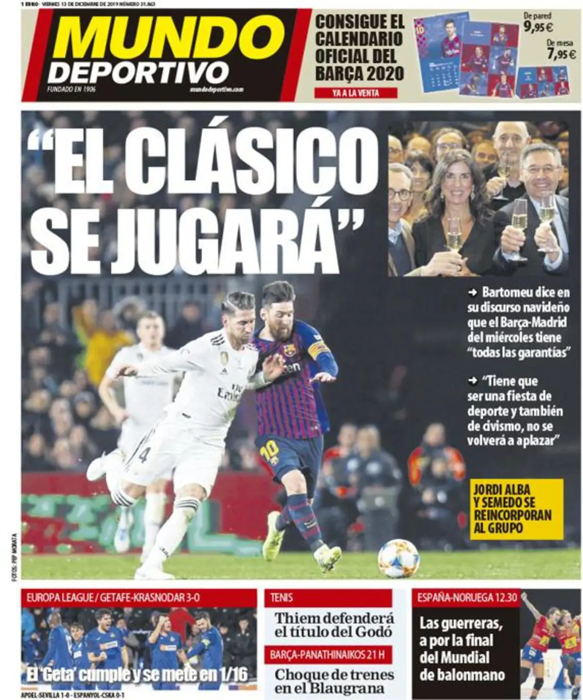 ركزت الصحيفة على تصريحات جوسيب ماريا بارتوميو رئيس برشلونة حول الكلاسيكو وكتبت "الكلاسيكو سيُلعب".