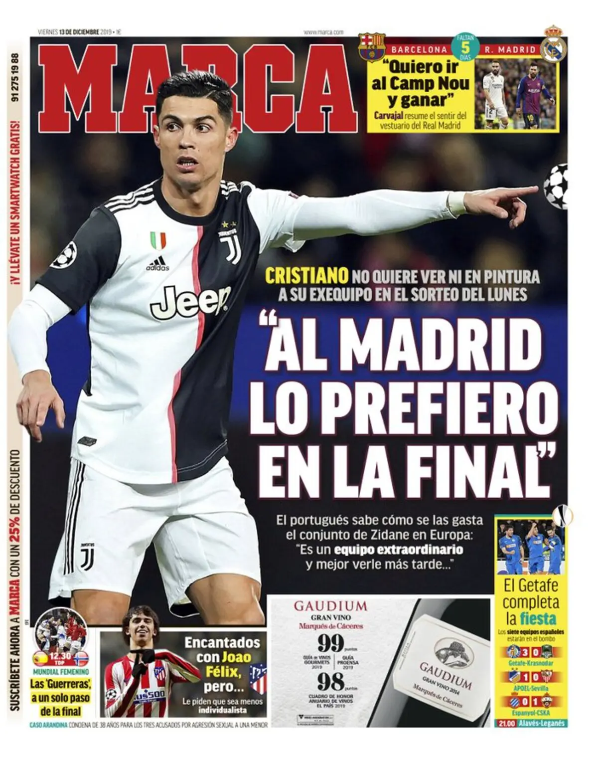 ركزت الصحيفة على تصريحات النجم البرتغالي كريستيانو رونالدو مهاجم يوفنتوس الحالي والنجم السابق لريال مدريد وكتبت "رونالدو: ريال مدريد أفضل مواجهته في النهائي".