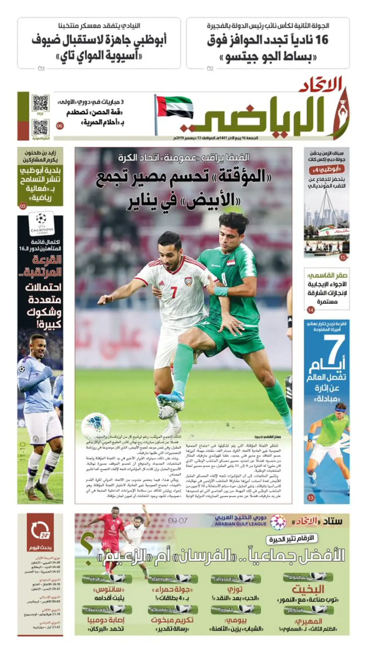 ركزت الصحيفة على المنتخب الإماراتي وكتبت "المؤقتة تحسم معسكر الأبيض في يناير".