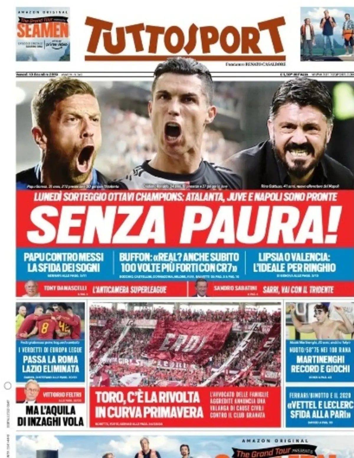 ركزت الصحيفة على القرعة المنتظرة لدور الـ16 من دوري أبطال أوروبا والفرق التي بإمكانها مواجهة الفرق الإيطالية الثلاثة المتأهلة يوفنتوس ونابولي وأتلانتا وكتبت "دون خوف".