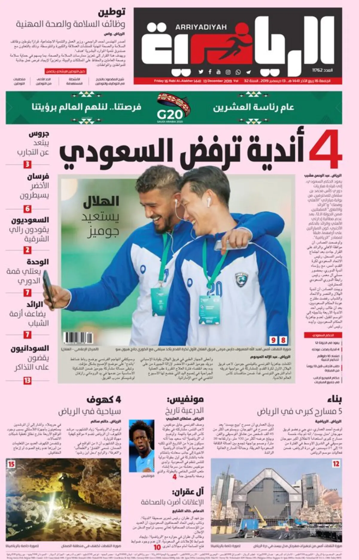 ركزت الصحيفة على التحكيم السعودي في دوري السعودي للمحترفين وكتبت "4 أندية ترفض السعودي".