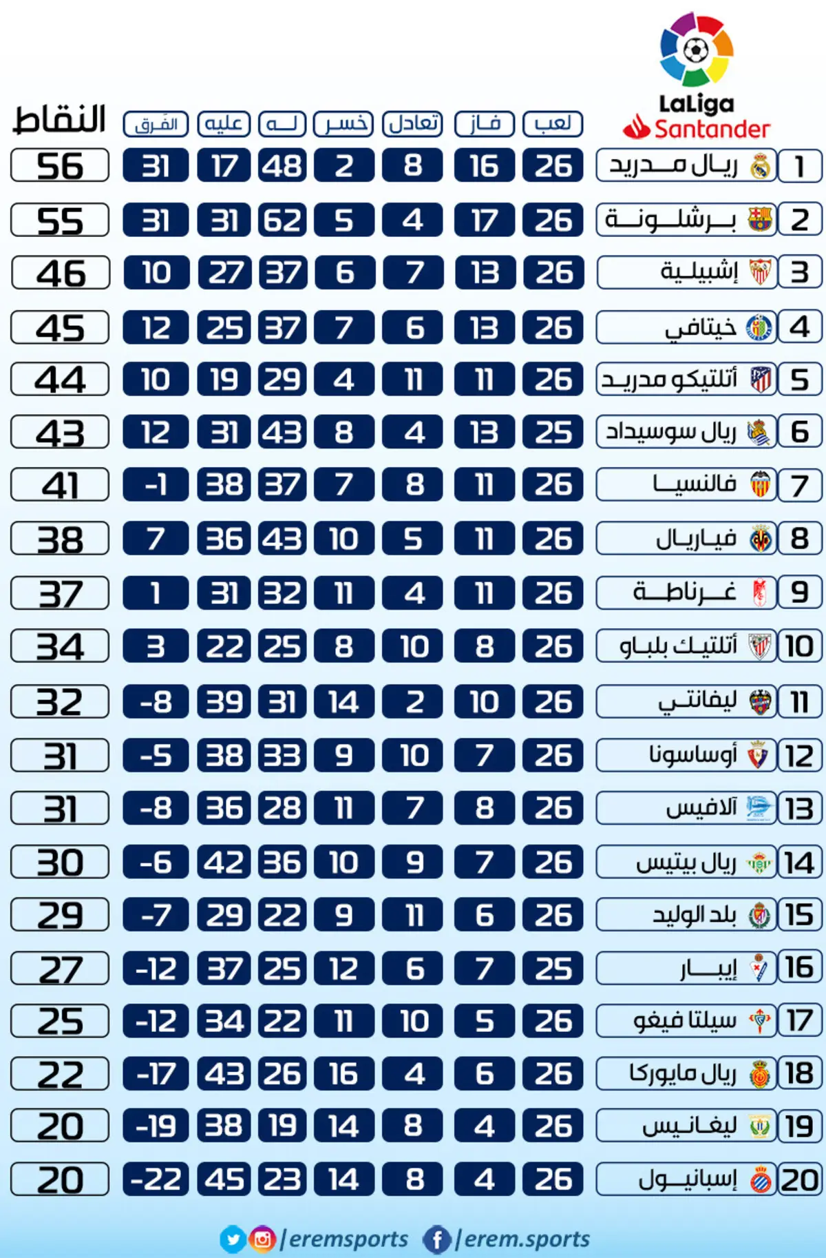 وفيما يلي جدول ترتيب الدوري الإسباني كاملًا: