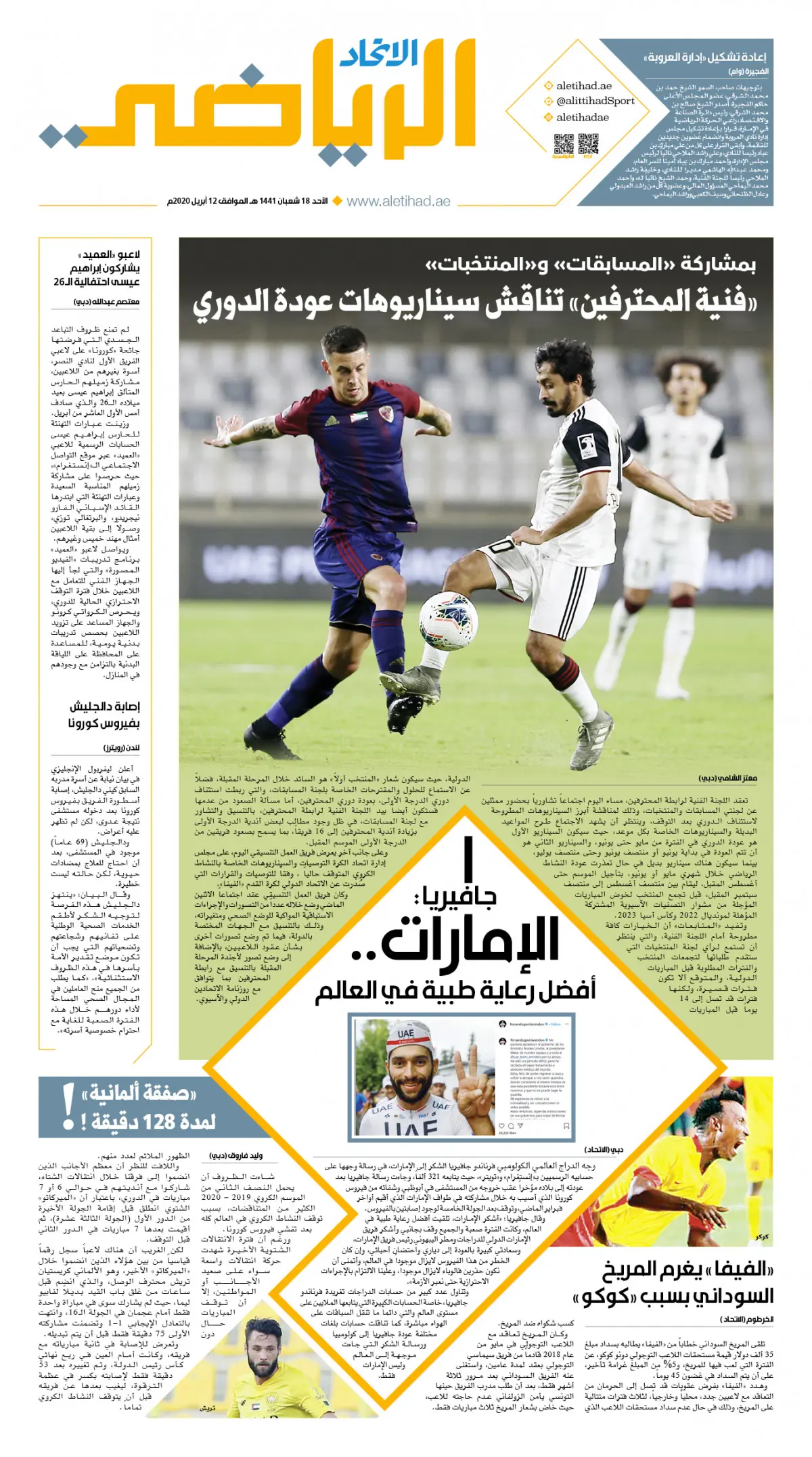 ركزت الصحيفة على موعد عودة الدوري الإماراتي، وكتبت: "فنية المحترفين تناقش سيناريوهات عودة الدوري".