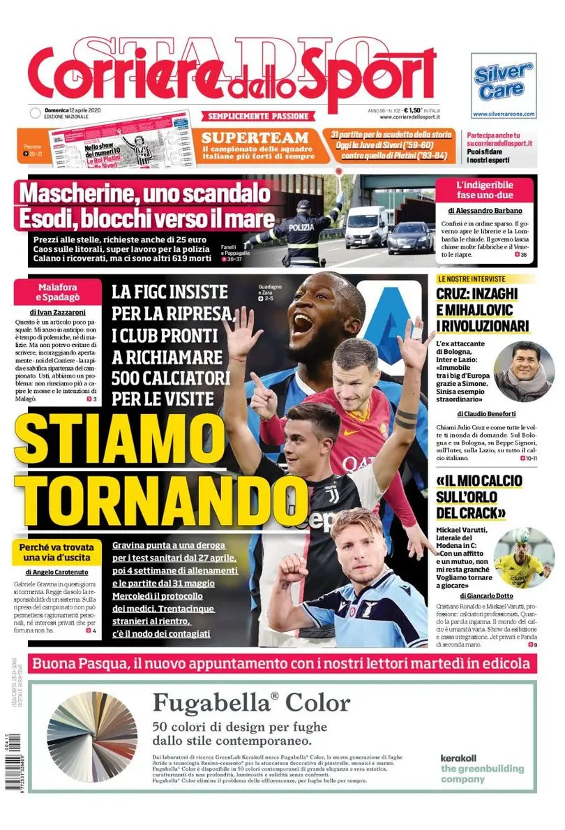 ركزت الصحيفة على إمكانية عودة كرة القدم في إيطاليا في ظل التوقف الحالي بسبب انتشار فيروس كورونا، واستمرار حالة الطوارئ الصحية، وكتبت: "سنعود".