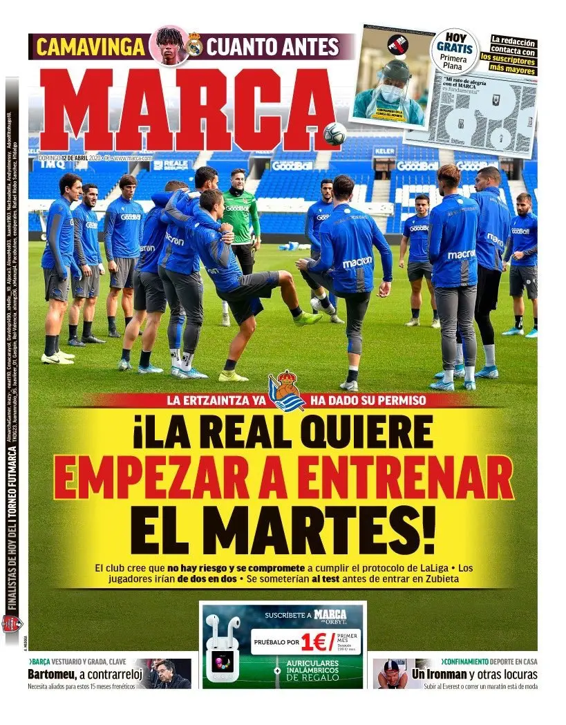 ركزت الصحيفة على رغبة ريال سوسيداد العودة للتدريبات، وكتبت: "سوسيداد يرغب في العودة للتدريبات الثلاثاء".