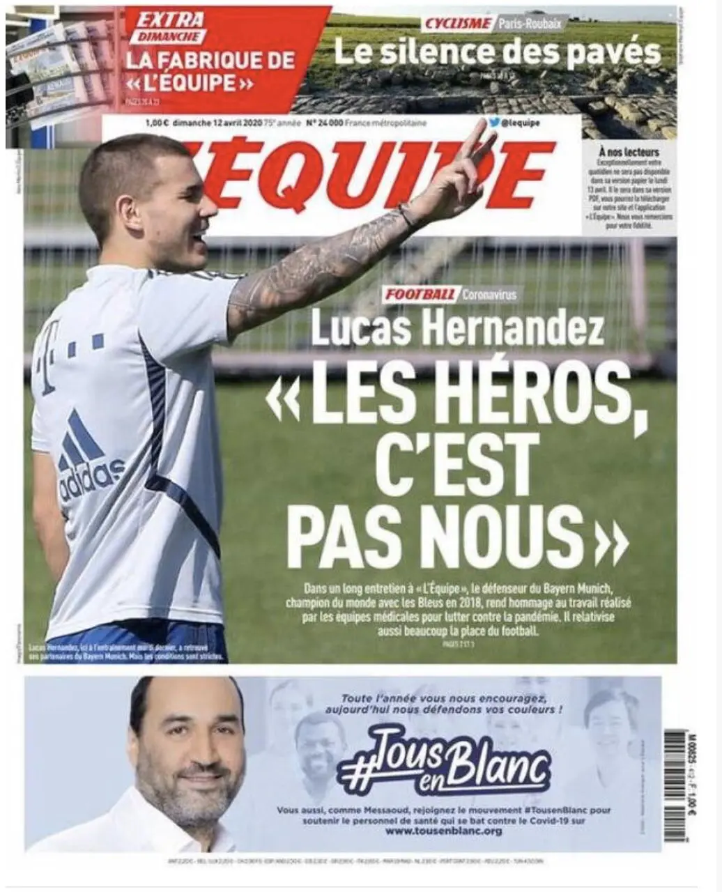 ركزت الصحيفة على حوارها مع الفرنسي لوكاس هيرنانديز، مدافع بايرن ميونخ ومنتخب فرنسا، وكتبت: "لوكتس هيرنانديز: الأبطال ليس نحن".