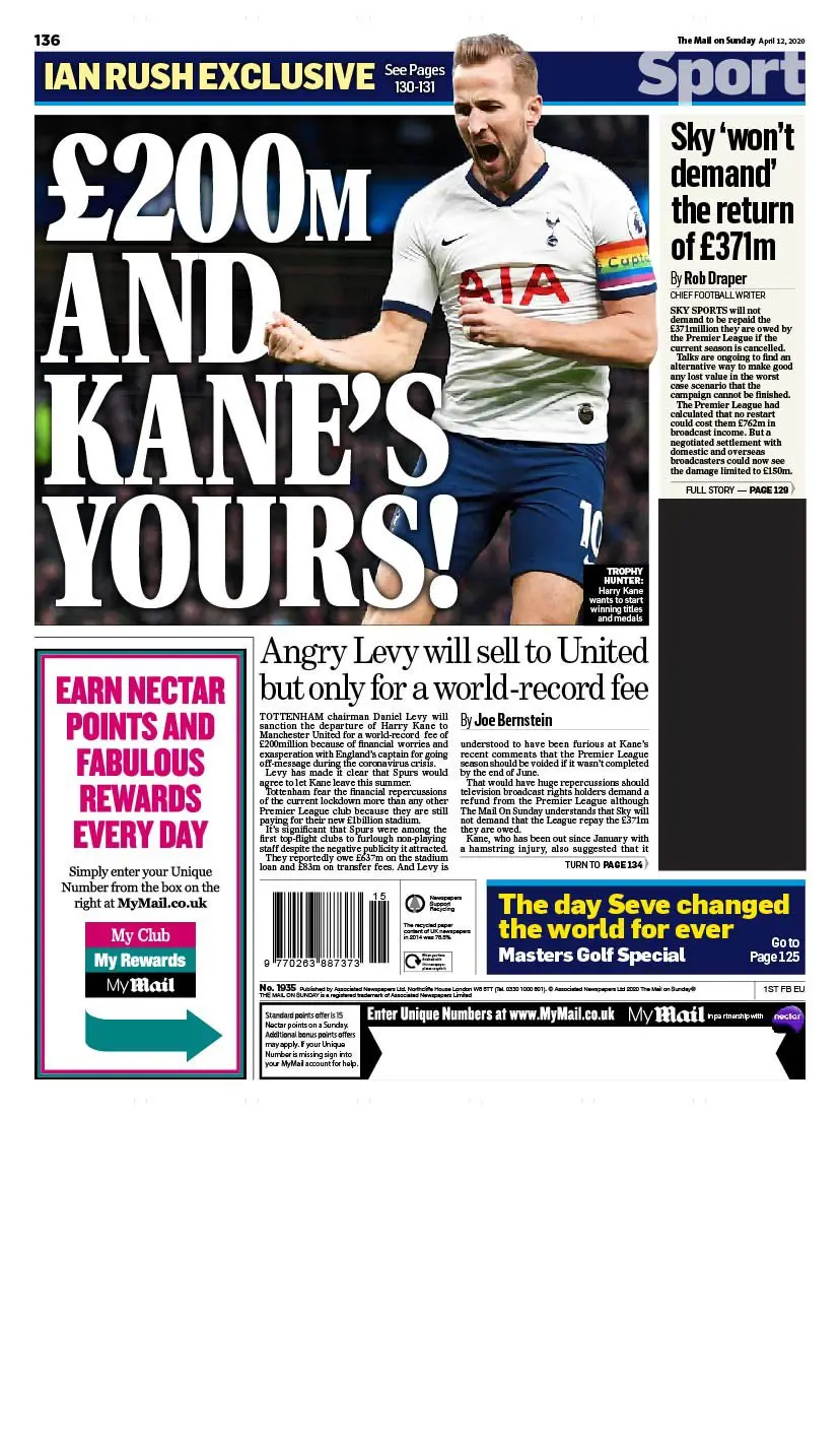 أبرزت الصحيفة في عنوانها القيمة التي يريدها نادي توتنهام للتخلي عن لاعبه هاري كين، وكتبت: "200 مليون جنيه إسترليني وكين سيصبح ملكًا لك".
