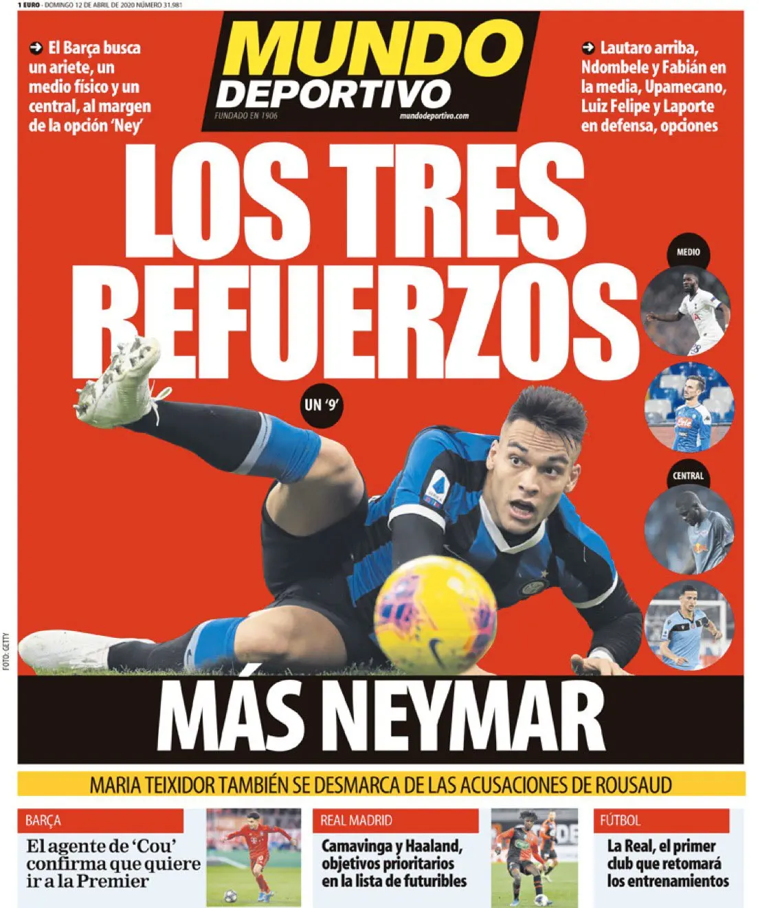ركزت الصحيفة على سوق انتقالات برشلونة واللاعبين المرشحين للانضمام الصيف المقبل، وكتبت: "التعزيزات الثلاثة المقترحة بالإضافة إلى نيمار".