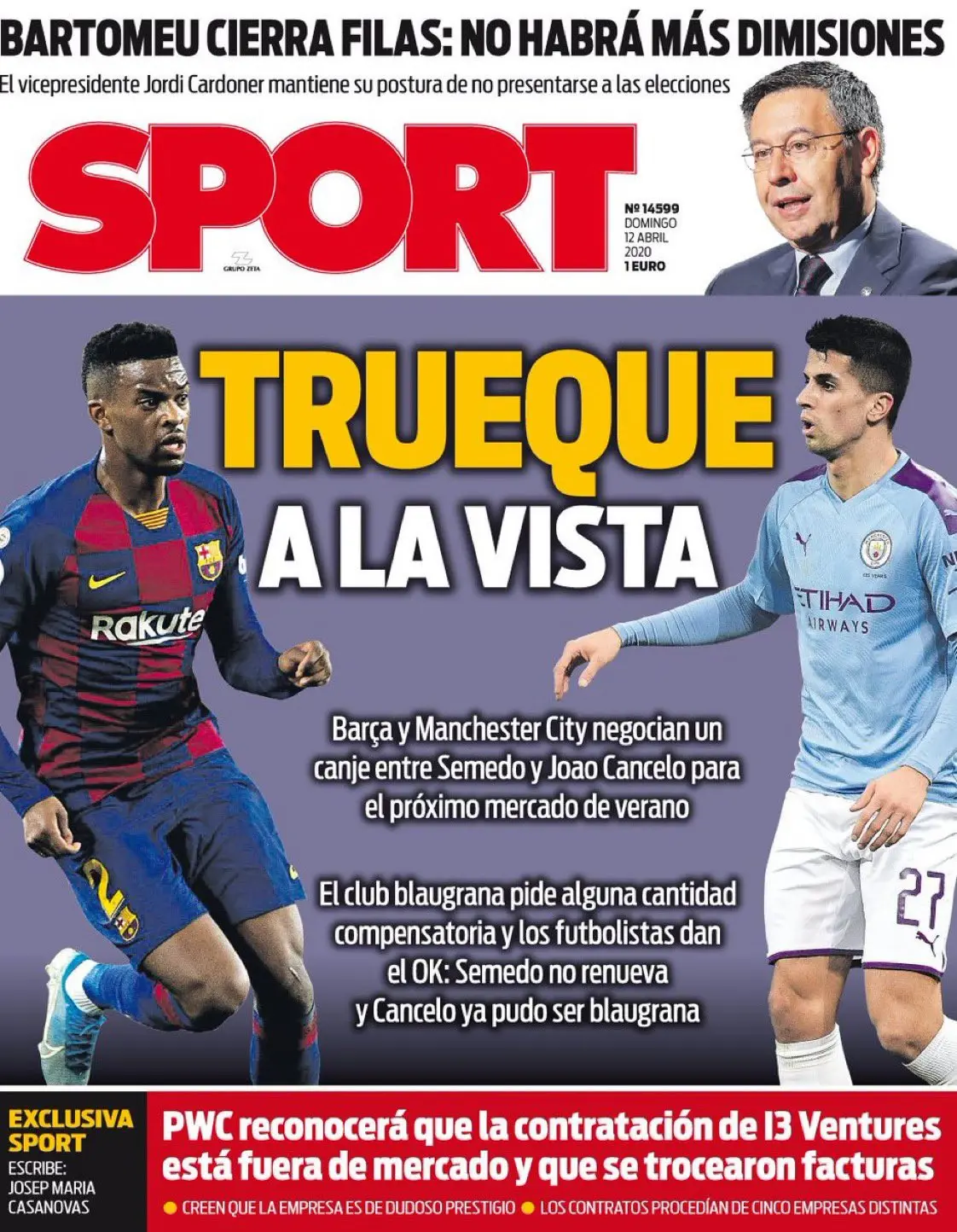 ركزت الصحيفة على الصفقة التبادلية بين برشلونة ومانشستر سيتي، والتي تخص البرتغاليين سيميدو وكانسيلو، وكتبت: "مقايضة في الأفق".