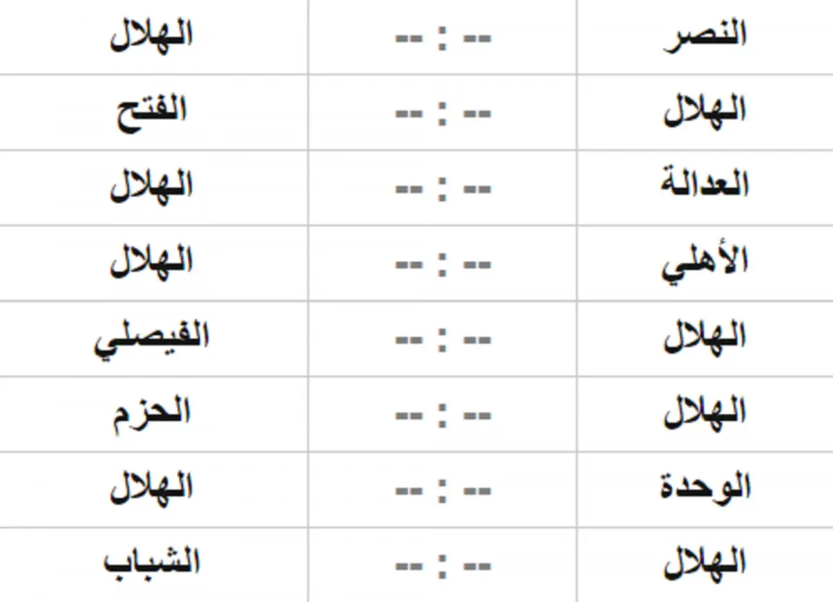 ويلعب الهلال مع النصر والفتح والعدالة والأهلي، كما يلاقي الفيصلي والحزم والوحدة والشباب.