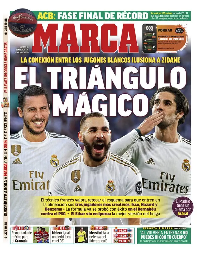 ركزت الصحيفة على ريال مدريد واختيارات زيدان في المباراة المقبلة أمام إيبار في الخط الهجومي واهتمت بالثلاثي: كريم بنزيما، وإدين هازارد، وإيسكو وكتبت:"الثلاثي السحري".