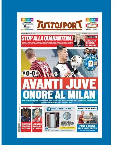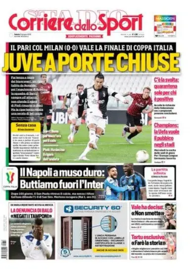 ركزت الصحيفة على تأهل يوفنتوس لنهائي كأس إيطاليا بعد تعادل سلبي أمام ميلان في مباراة عودة كرة القدم الإيطالية، وكتبت:"يوفنتوس خلف أبواب مغلقة".