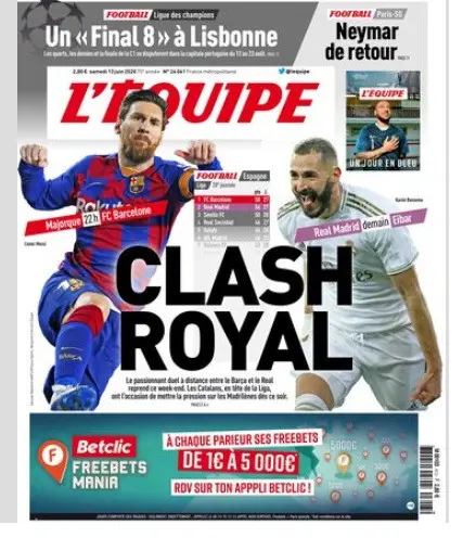 ركزت الصحيفة على عودة الدوري الإسباني والصراع حول اللقب بين ريال مدريد وبرشلونة، حيث يلعبان لقاءاتهما في نهاية الأسبوع، وكتبت:"صِدام ملكي".