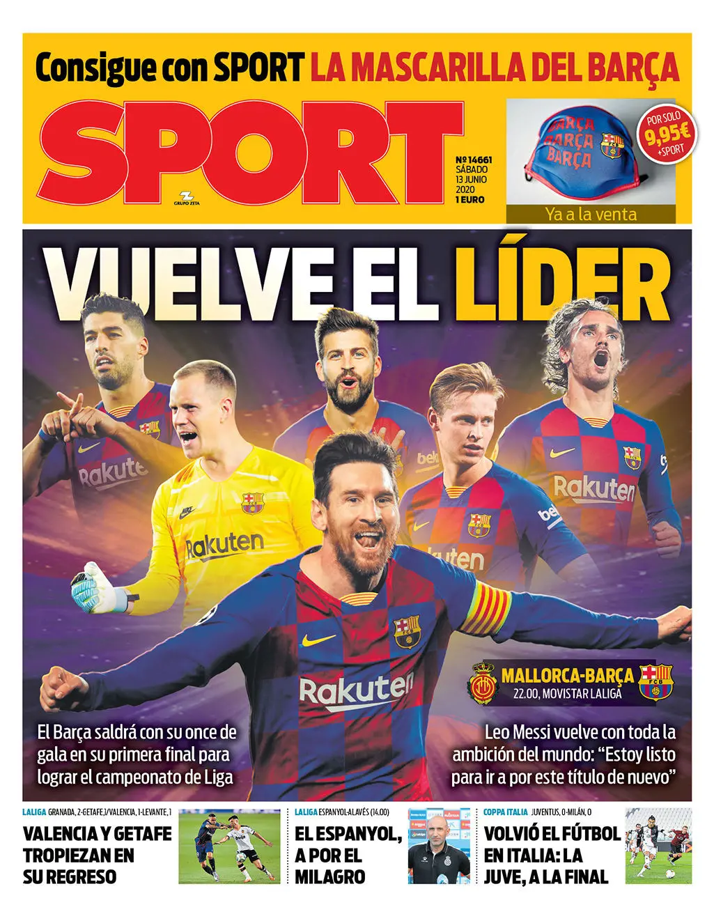 ركزت الصحيفة على عودة برشلونة للعب في الدوري الإسباني، حيث يرحل لمواجهة ريال مايوركا، وكتبت: "عودة المتصدر".