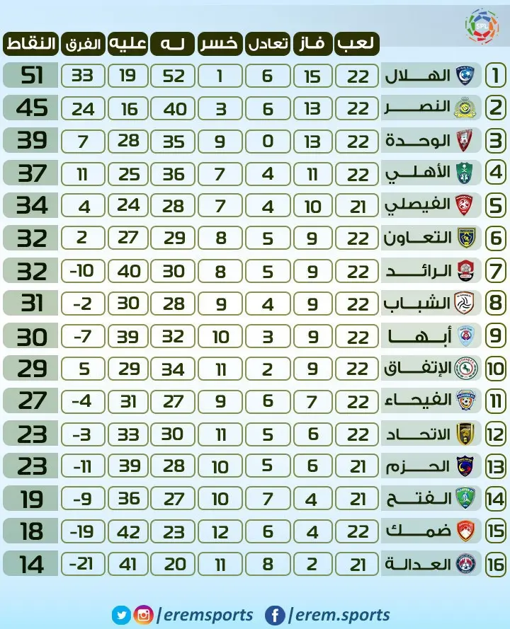 ويتصدر الهلال مسابقة الدوري برصيد 51 نقطة من 22 مباراة متقدمًا بـ6 نقاط على النصر حامل اللقب قبل 8 جولات على النهاية.