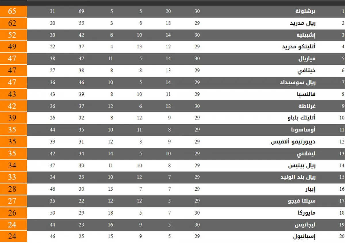 ويأتي أتلتيكو مدريد في المركز الرابع، وفي رصيده 49 نقطة من 29 مباراة، ويتبعه خيتافي بـ47 نقطة من 29 مباراة.